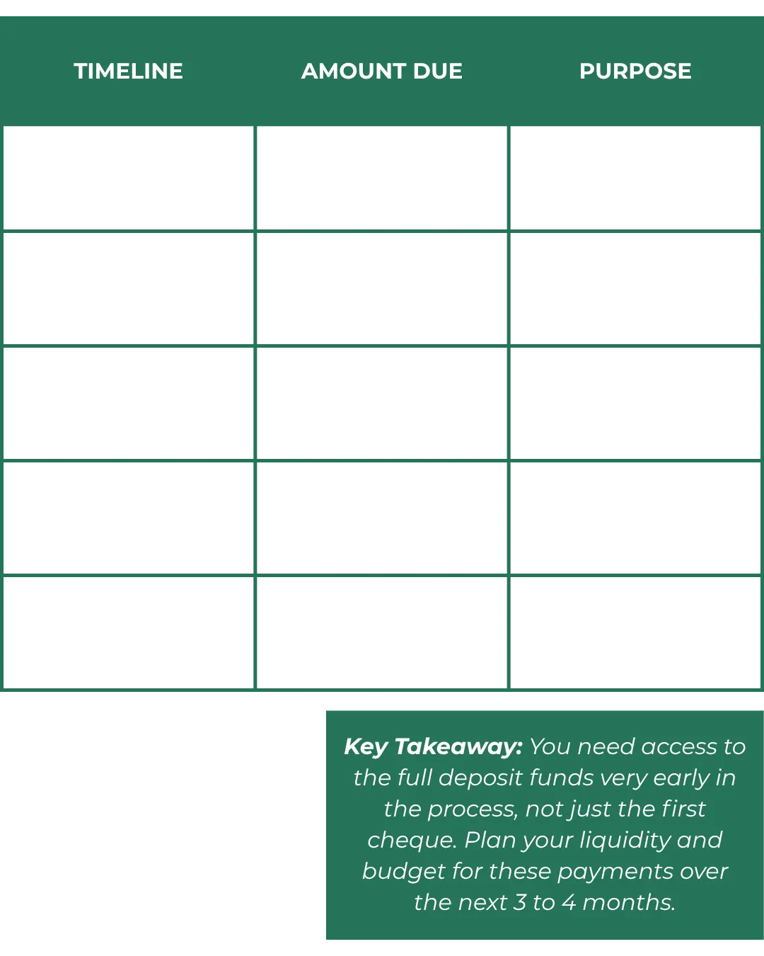 Key Takeaway: You need access to the full deposit funds very early in the process, not just the first cheque. Plan your liquidity and budget for these payments over the next 3 to 4 months.
